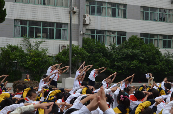 上一周,他们通过小快板说《弟子规》中关于“行走礼”的章节,意在从传统中找寻文明行走的源泉,赢得大家的广泛认同;而今天,他们则以即将在我们南京隆重举行的青奥会为契机,引导所有同学走出青奥的风采,走出昂扬的姿态,走出健美的体魄,走出少年的气概。当“迎接另一个晨曦,带来全新空气……”的奥运主题曲在校园上空响起时,四年级的学生代表展示了少年们一组组优雅的行走姿态,让大家啧啧赞叹,惊叹于走路所能反映出的一个人的内涵和气质。随后,四年级的同学们为大家进行瑜伽表演,旨在塑造形体之和谐,让行走更具美感。他们接连展示了顶天式、半月式、牛面式等难易不一的姿势,并热情邀请老师和同学们和他们一起互动。和着优美抒情的音乐,台上台下顿时沉浸在一片健康、欢乐、美好的海洋之中。