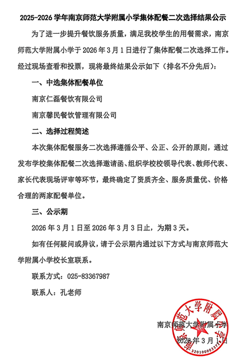 南京师范大学附属小学2026年物业服务框架协议二次比选结果公告
