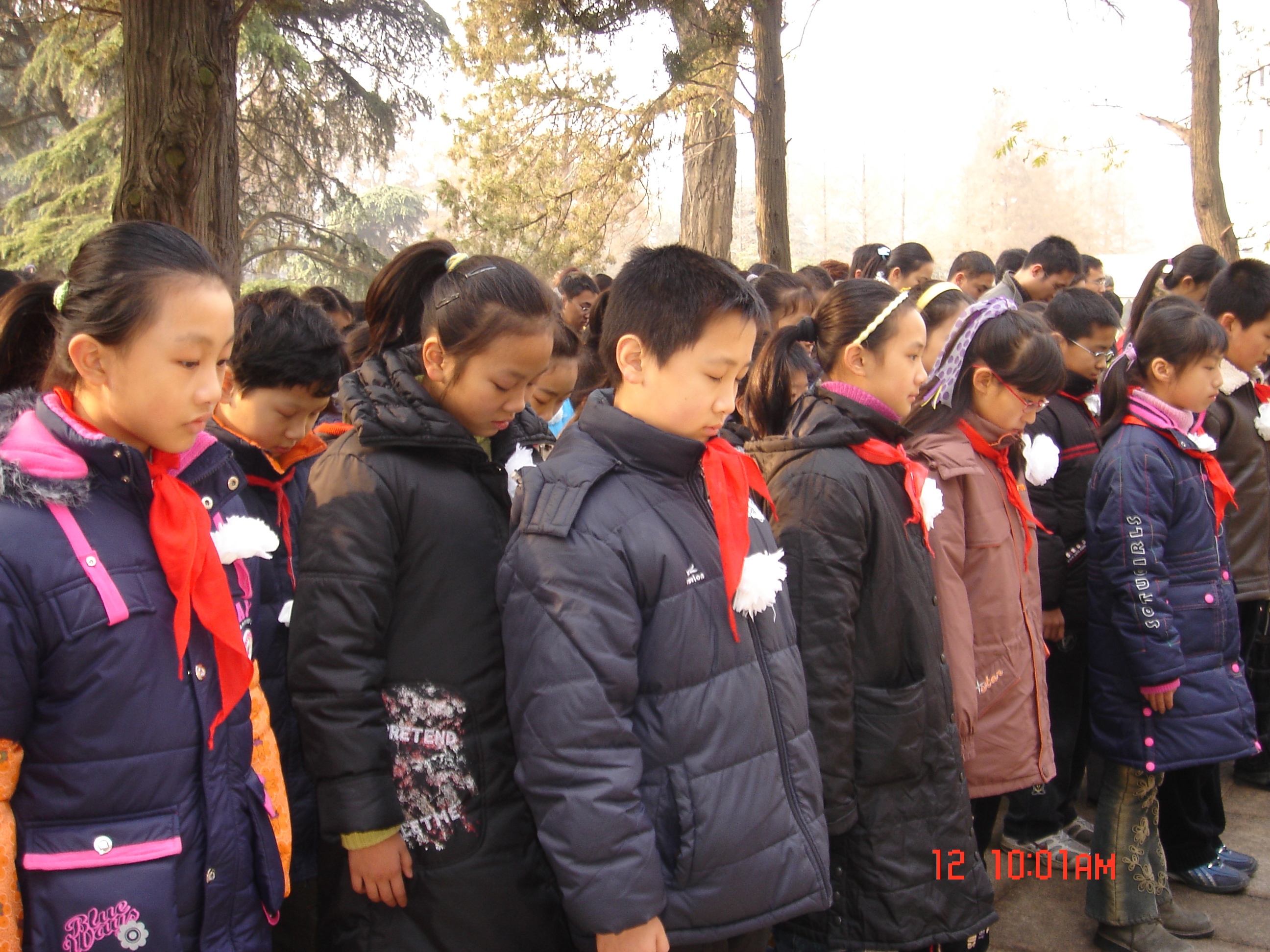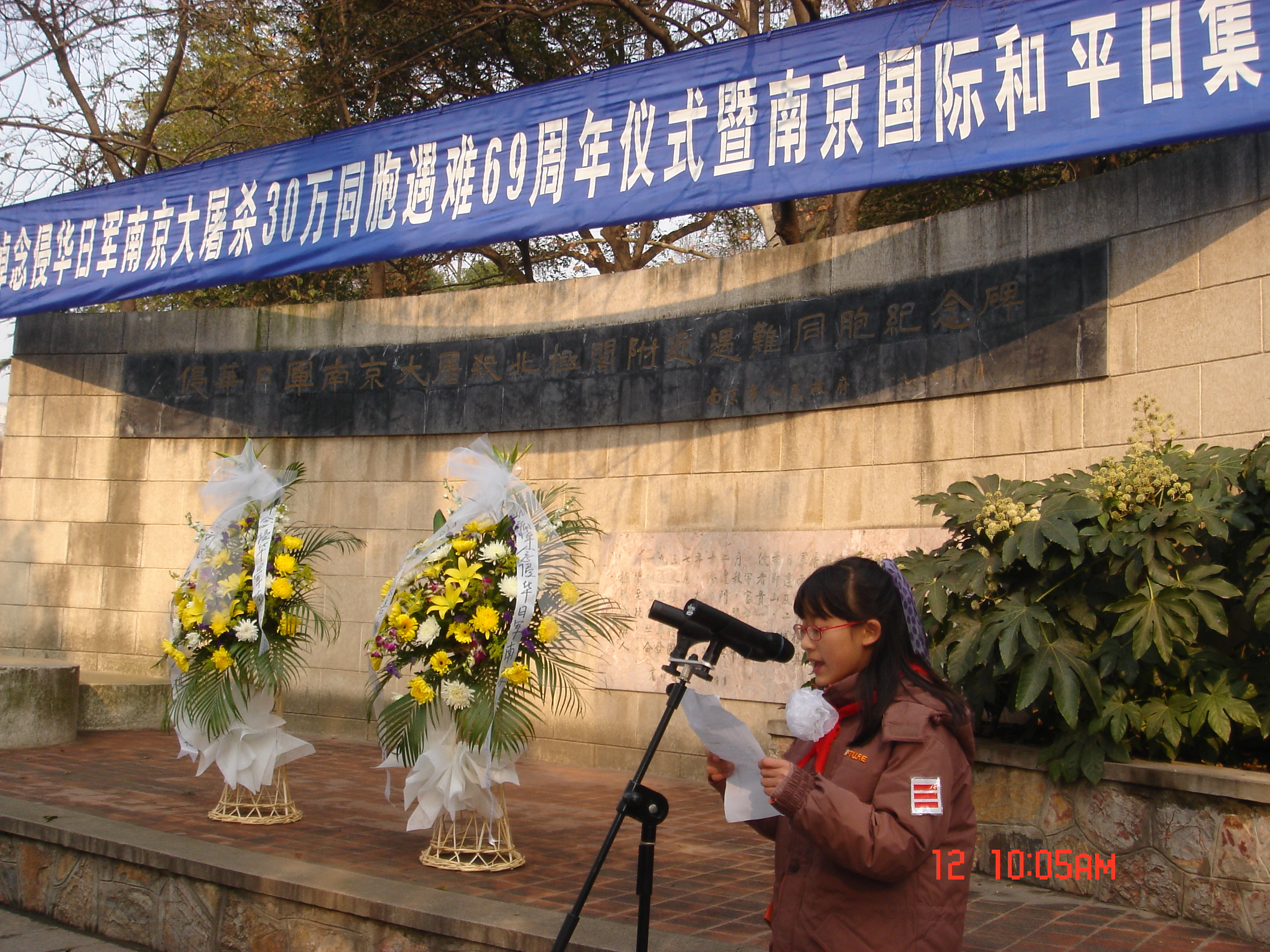 12月13日上午,南师大附小近百名少先队员代表佩戴小白花,在北极阁举行国际和平集会,沉痛悼念南京大屠杀30万同胞遇难69周年。玄武区委、区政府领导也出席了今天的和平集会。