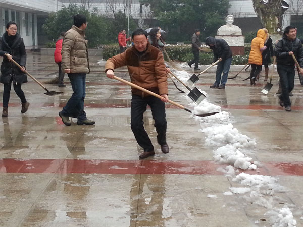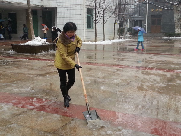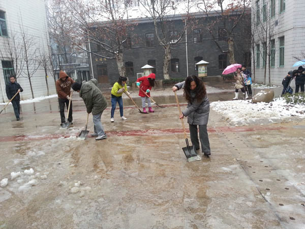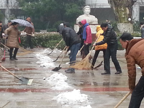 开学第二天,南师附小老师们用自己的实际行动诠释了附小“爱的教育”的含义,用爱心扫净地面的积雪,让温暖留在了每一位师生的心间。(南师附小许海雁)