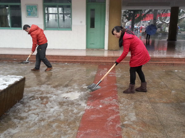 2月16日晚,南京下起了鹅毛大雪。2月17日早上,南师附小的校园中已经披上了白色的“外衣”。据预测,18日还将继续降温下雪。为了防止当天的冰雪冻住,造成孩子们的出行不便,附小的党员教师、“帮帮吧”志愿成员和“青年文明号”号员们在孩子们放学后拿着铲子和大扫把,认真地清扫着校园地面上的积雪。大家齐心协力,相互合作,你铲这一块,我扫那一块,不多久,大家的额头上都沁出了汗珠,身上也逐渐暖和起来了。原本覆盖着积雪的校园已经焕然一新,变得清爽又整洁了。