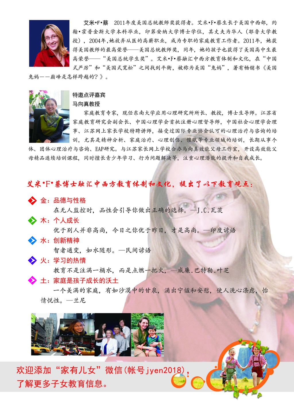 艾米·F·蔡 2011年度美国总统教师奖获得者。艾米·F·蔡生长于美国中西部,约翰·霍普金斯大学本科毕业,印第安纳大学博士学位,其丈夫为华人(耶鲁大学教授),2004年,她放弃从医的高薪职业,成为专职的家庭教育工作者。2011年,她获得美国教师的最高荣誉——美国总统教师奖,同年,她的孩子也获得了美国高中生最高荣誉——“美国总统学生奖”。艾米·F·蔡融汇中西方教育体制和文化,在“中国式严厉”和“美国式宽松”之间找到平衡, 被称为美国“兔妈”,著有畅销书《美国兔妈--巅峰是怎样跨越的?》。
