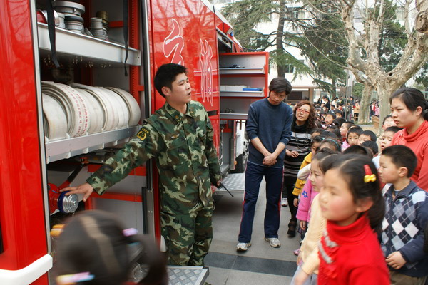 全校同学有序地来到操场指定位置。先后听取了消防队叔叔讲授消防安全知识、逃生的方法以及灭火器的正确使用等,并现场请了六年级各班安全员进行灭火器灭火演习。消防队员还指导同学如何正确、快速的穿上消防服,并现场演习了利用救生气垫进行火场逃生的技巧。演习成功后,全校同学给予了官兵们最热烈的掌声!最后,全校师生还分为三组参观了几辆消防车,了解到了更多的消防知识。