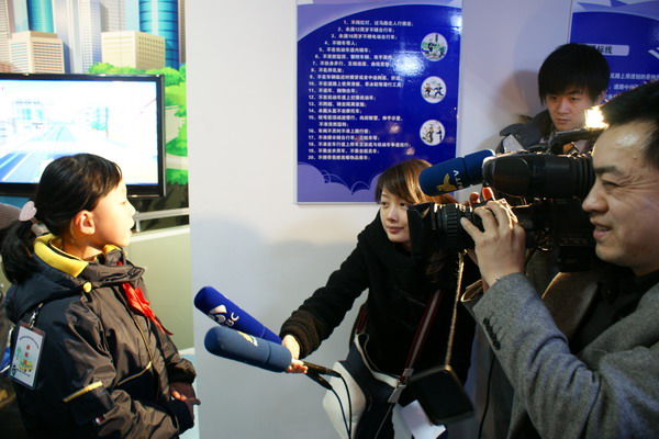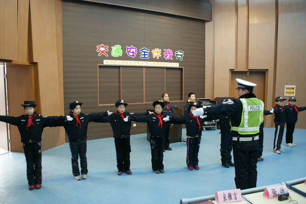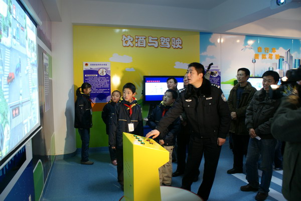 该校在南京市民防局的大力支持下,建成了南京市中小学第一家交通安全教育馆,会后来宾和同学们一起饶有兴趣的参观了展厅。在小讲解员的带领下,