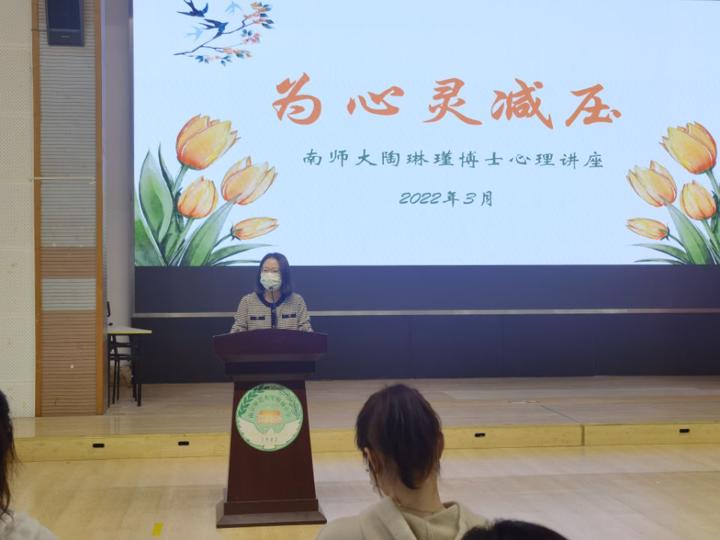 3月11日下午,一场名为“为心灵解压,伴孩子成长——与老师们谈谈心育”的讲座在南京师范大学附属小学体育馆举行,本次讲座由袁媛副校长主持,并邀请了南师大心理学院陶琳瑾教授主讲,余颖校长、李昌亮书记和全体教师参加了本次讲座。