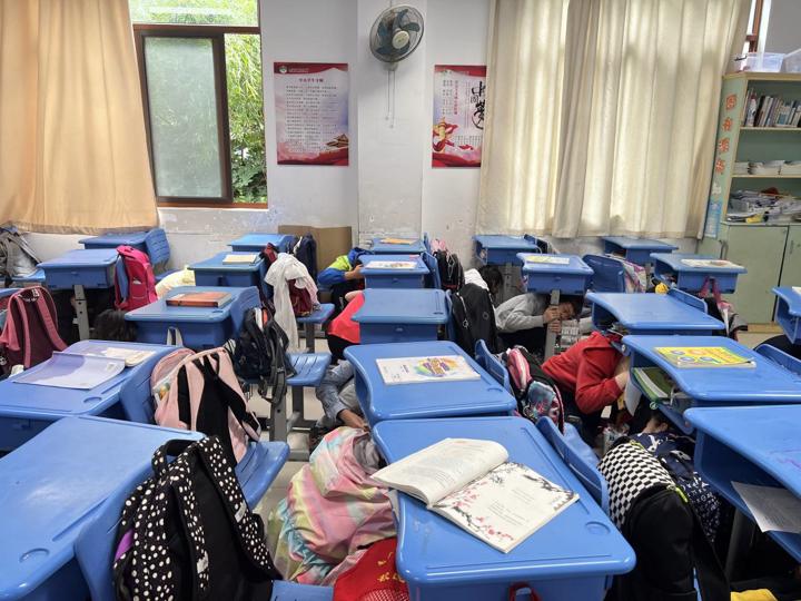 伴随着广播系统发出第一声“地震警报”,靠近前后门的同学快速打开门并就近蹲下;其他同学迅速拿出书本书包保护头部,同时蜷缩起身子,降低重心躲到各自课桌下。