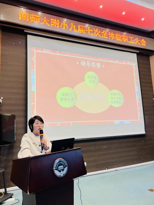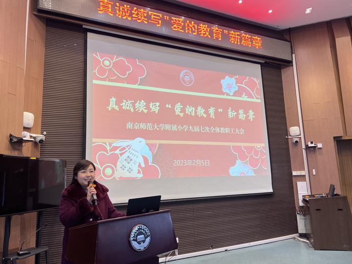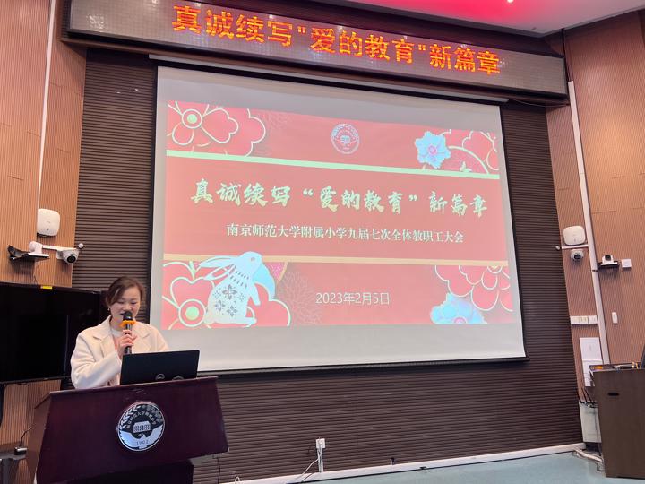 春到附小生百福,年看得意展鸿图。为进一步凝聚学校发展共识,激励全校教职员工奋力谱写学校事业发展新篇章,2023年2月5日上午9点,南师大附小九届七次全体教职工大会在四牌楼校区阶梯教室顺利召开。本次会议由工会主席郭静副校长主持。
